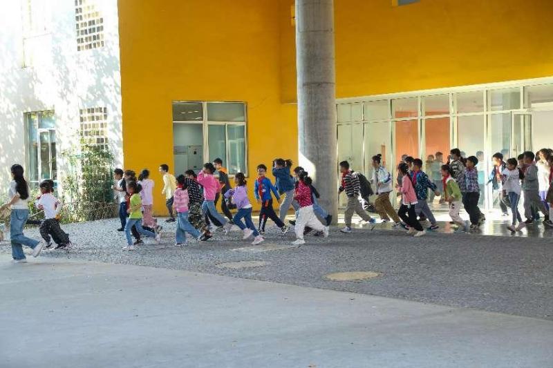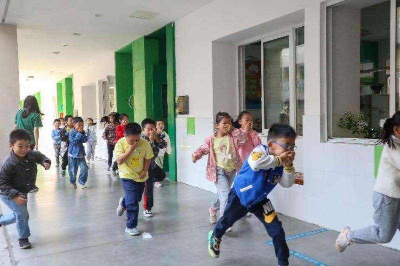 随着紧急的火灾警报响起,所有学生在老师的指挥下,弯腰、捂鼻,沿着学校指定的安全线路,有序地撤离到安全地带。