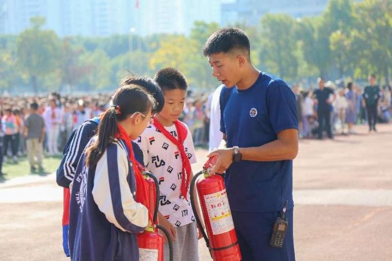 到达操场后,消防员叔叔给学生们详细讲解了灭火器的使用,学生代表进行实操,让学生们了解了消防安全知识,更学会了火灾时的正确灭火程序。