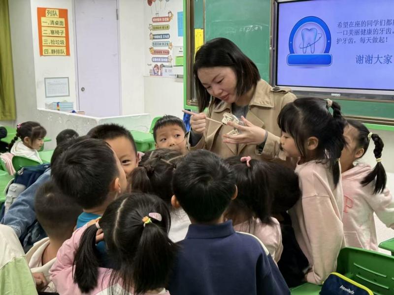 口腔健康与儿童的生长发育和身心健康息息相关。为了增强小学生的口腔自我保护意识,普及少年儿童的口腔健康教育,同时让学生从小养成爱牙,护牙的好习惯,一(6)班董恩绮妈妈用生动有趣的语言,配合图文并茂的内容,带着孩子们观察牙齿模型,了解了牙齿的构造。通过互动交流,孩子们还知道了牙齿对咀嚼、发音、美观等都有着重要的影响,更学会了保护牙齿的方法。孩子们现场体验了如何清洁口腔,正确刷牙,进一步帮助他们养成良好的生活习惯。