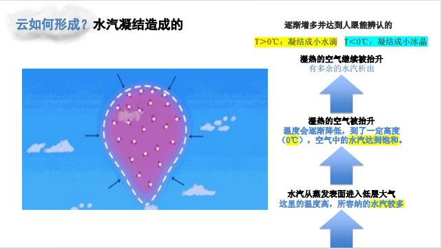 这些小水滴或冰晶大量聚集并悬浮在空中,就形成了云。如果空气继续冷却或水汽持续增加,云会变得更厚,最终可能导致降水(如雨、雪)。不同的云类型(如积云、层云、卷云)是由于空气的运动方式和环境条件(如湿度、温度和风力)不同所形成的。
